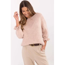Štýlový dámsky sveter s ležérnym charakterom, ktorý sa skvele hodí na každý deň aj do práce. Je vyrobený z vysokokvalitnej zmesi akrylu, vlny (lana), viskózy a polyamidu, je mäkký, príjemný na dotyk a pohodlný na nosenie. Hladký vzor mu dodáva elegantnú jednoduchosť a 3/4 rukávy zdobené jemným volánom mu dodávajú ženský šarm. Štandardná dĺžka ho umožňuje dokonale kombinovať s džínsami aj formálnymi nohavicami alebo sukňami. Je ideálnou voľbou pre ženy, ktoré ocenia štýl, pohodlie a nadčasovú eleganciu.