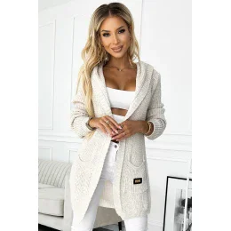 Kardigán, hrejivý overal s kapucňou, vreckami a aplikáciou. Vyrobený zo silnejšieho svetrového materiálu v béžovej farbe. Značka numoco. Európska výroba. materiál: 100%akryl