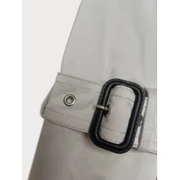 Kabát je vypasovaný, má dlouhé rukávy, límec a klopy, pásek s přezkou, dvě kapsy a zapíná se knoflíky. Model má délku do poloviny stehen.
