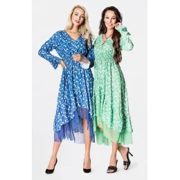 Šaty mají výstřih ve tvaru písmene "V". V pase modelu je guma. Model má dlouhé rukávy s volánky. Spodní část šatů je rozšířená a asymetrická. Šaty mají ve přední části délku ke kolenům a vzadu ke kotníkům.