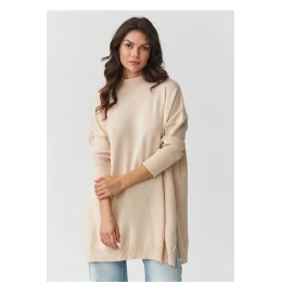 Nadrozmerný dámsky sveter s prevahou viskózy je stelesnením pohodlia a ženskej elegancie v každodennom prevedení. Mäkký, jemný materiál objíme telo ako druhá koža a poskytuje pohodlie počas celého dňa bez ohľadu na príležitosť. Vďaka nadrozmernému strihu a jemným rozparkom na bokoch sveter krásne sedí na postave, dodáva jej ľahkosť a voľnosť. Výstrih nielen zvýrazňuje krk, ale zároveň dodáva celku moderný a rafinovaný charakter. Ide o ideálnu ponuku pre ženy, ktoré ocenia spojenie jednoduchosti a štýlu, pričom sa dokonale hodí k džínsom aj elegantným nohaviciam alebo legínam. Tento model sa stane vaším obľúbeným spoločníkom počas chladnejších dní, obklopí vás jemnosťou a decentnou eleganciou.