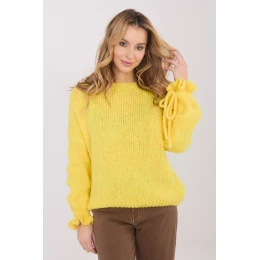 Dámský svetr s casual charakterem, ideální pro každodenní stylizace a práci. Model standardní délky, vyrobený z měkké a příjemné směsi akrylu, polyamidu, viskózy a vlny, která zajistí pohodlí a teplo. Hladký vzor dodává svetru univerzální vzhled, díky čemuž je snadné ho sladit s různými kousky šatníku. Klasický, kulatý výstřih a dlouhé rukávy zdůrazňují nadčasový střih. Ozdobné volánky s mašlí u rukávů dodávají celku ženský šarm a jemnou originalitu. Svetr nemá zapínání, co zajistí pohodlí a volnost nošení.