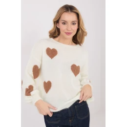Dámsky sveter s ležérnym charakterom, navrhnutý s ohľadom na každodenný pohodlný styling. Model je vyrobený z mäkkej a hrejivej zmesi akrylu, mohéru a vlny a poskytuje príjemný pocit aj počas chladnejších dní. Sveter má výraznú potlač srdiečok, ktorá mu dodáva ženský a módny charakter. Štandardná dĺžka, klasický okrúhly výstrih a dlhé rukávy zaručujú pohodlie a všestrannosť. Puzdrové rukávy sú štýlovým akcentom, ktorý celku dodáva ľahkosť a originalitu. Sveter je ideálny na každodenné nosenie k džínsom alebo sukniam.