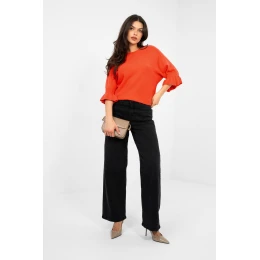 Elegantný dámsky sveter štandardnej dĺžky, ktorý je ideálny na každodenné nosenie aj na výnimočné príležitosti. Je vyrobený z vysokokvalitnej zmesi viskózy, polyesteru a nylonu a poskytuje pohodlie a odolnosť. Hladký vzor mu dodáva nadčasový charakter, zatiaľ čo jemné detaily mu dodávajú ženský pôvab. Model má okrúhly výstrih a 3/4 rukávy zakončené jemným volánom, ktorý podčiarkuje eleganciu a ľahkosť oblečenia. Skvelá voľba pre ženy, ktoré ocenia klasiku v modernom prevedení.