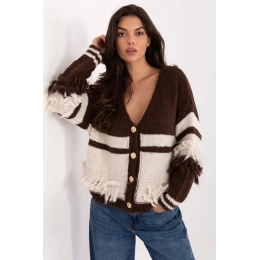 Tento dvojfarebný dámsky sveter je módnym prvkom ležérneho šatníka, ideálnym na každodenné vychádzky a príležitosti. Je vyrobený zo zmesi polyakrylu, polyamidu, vlny a viskózy a poskytuje teplo, pohodlie a radosť z nosenia. Bláznivý výstrih a ozdobné zapínanie na gombíky mu dodávajú elegantný charakter. Dlhé rukávy a štandardná dĺžka zaručujú pohodlie pri nosení. Strapce na prednej strane a rukávoch prinášajú originálny, mierne bohémsky nádych a dodávajú svetru jedinečný štýl. Ide o sveter, ktorý spája pohodlie, funkčnosť a módny dizajn, ideálny na bežné a štýlové kombinácie.