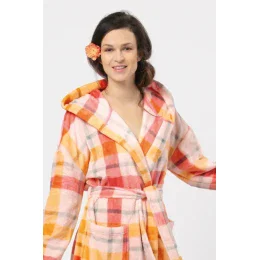 ženský, klasický strih je zvýraznený výnimočne hodvábnym a mäkkým úpletom Velvet Super Soft, ktorý zaručuje odolnosť a pohodlie pri nosení. Priestranný, ľahký károvaný komplet vo veselých jesenných farbách broskyňovej a béžovej rozžiari všetky večery a rána. Celý komplet je doplnený hlbokými prednými vreckami a pohodlnou voľnou kapucňou. Je ideálny po kúpeli alebo pri vrstvení na pyžamo.