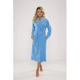 Dlhý, pohodlný dámsky župan s kapucňou. Ušitý je z príjemného velúru. Má vrecká a v páse je na zaviazanie. Obšitý kontrastnými lemami.