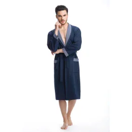Pohodlný pánsky župan so zaväzovaním v páse, golierom a vreckami ukončenými kontrastnou látkou.