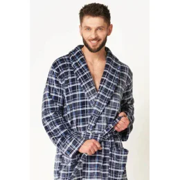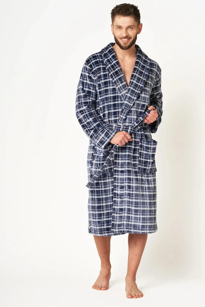 Długi szlafrok męski o klasycznym kroju. Przestrzenna krata w stonowanych kolorach bieli i granatu podkreśla jego elegancję i daje efekt 3D. Długość do połowy łydki, boczne kieszenie i wygodny szalowy kołnierz. Przyjemny dla Ciała szlafrok z wyjątkowo lekkiej i miękkiej dzianiny typu FLANNEL FLEECE, która zapewnia trwałość i komfort noszenia. Idealnie sprawdzi się na chłodny jesienno – zimowy czas.
