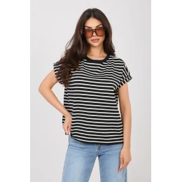 Dámské tričko standardní délky vyrobené z tlusté, vysoce kvalitní bavlny, která zaručuje trvanlivost a pohodlí při nošení po celý den. Přírodní, prodyšný materiál zaručuje, že tričko bude skvěle vypadat v každodenních outfitcích, bez ohledu na roční období. Model v casual stylu se vyznačuje dominujícím pruhovaným vzorem, který mu dodává nadčasový charakter. Krátký rukáv a klasický kulatý výstřih podtrhují univerzální střih a zajišťují, že tričko se skvěle hodí jak k džínům, tak k sukní nebo kraťasům. Ideální volba pro ženy, které ocení pohodlí, jednoduchost a nadčasový design.