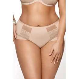 Elegantné nohavičky v béžovej farbe. Je vyrobený z mäkkého mikrovlákna a na prednej strane je zdobený dvoma krajkovými vsadkami. Na zadnej strane hladké. Nohavičky vpredu aj vzadu zakončené dvojito skladaným, jemným elastickým tylom.