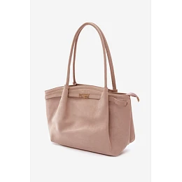 Dámská kabelka typu shopper vyrobená z imitace semiše je stylový a prostorný doplněk, ideální na každodenní nošení. Model má držadla a odnímatelný pásek, což umožňuje nošení kabelky různými způsoby – v ruce, na rameni nebo přes rameno. Zlaté kovové prvky dodávají eleganci. Vnitřek kabelky je prostorný a funkční – obsahuje tři praktické kapsy, které usnadňují organizaci a udržení pořádku. Šířka - 47 cm Výška - 27 cm Tloušťka - 8 cm.