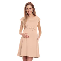 Tehotenské šaty voľného strihu s rozšírenou spodnou časťou. Šaty s ozdobnou mašľou na prednej strane a vreckami.