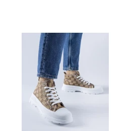 Hnedé tenisky zdobené monogramom Terenzio sú skvelým návrhom na letné dni. Vďaka stredne vysokému podpätku sú pohodlné aj pri dlhom nosení. Ich obľúbený a elegantný strih z nich robí ideálny doplnok k mnohým letným outfitom. Sú vyrobené z gumy a poskytujú skvelú priľnavosť na rôznych povrchoch. Ďalšou výhodou je okrúhla špička, ktorá im dodáva jedinečný vzhľad. Tenisky majú šnúrky, vďaka ktorým si ich môžete prispôsobiť svojej nohe. Ideálne na letné prechádzky a každodenné výlety. - Materiál: Textil - Výška: Vysoká - Polstrovanie: Nie - Podrážka: Gumová - Farba podrážky: Biela - Zapínanie: Šnurovanie - Kolekcia: Letná