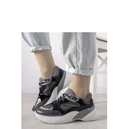 Čierne tenisky Rude s vysokou podrážkou sú módnym a pohodlným modelom vyrobeným z ekokože a lakovanej ekokože. Ich vysoký športový strih z nich robí hit tejto jesene. Tento model zdobený motívom popraskanej kože v metalickej farbe sa navyše vyznačuje štýlovým dizajnom. Tenisky majú štandardné číslovanie, preto je dobré vybrať si svoju bežnú veľkosť. Zapínanie na šnúrky zaručuje ideálne prispôsobenie sa nohe. Podrážka z bielej gumy dodáva teniskám charakter. Ideálne sú na jeseň/zimu, nemajú žiadnu výstuž, čo z nich robí ideálnu voľbu na chladnejšie dni.