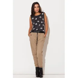 Nohavice so zníženým sedom pripomínajúce obľúbené "harémové" nohavice, navyše dokonale zamaskujú drobné nedostatky a vaša postava v nich bude vyzerať skvele. Vrchný diel je doplnený atraktívnym lemom z ekokože.