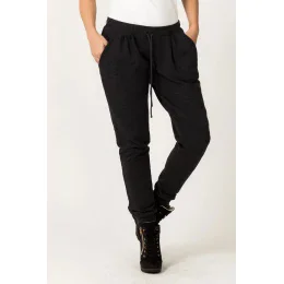 Tepláky z pletené teplákoviny v tmavě šedé barvě, dole zakončené širokým žebrováním, které je široké asi 10 cm. Velmi módní a pohodlné.