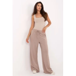 Ležérne nohavice v športovom štýle, ideálne na každý deň. Sú vyrobené z mäkkej zmesi viskózy, polyesteru a elastanu, vďaka čomu poskytujú pohodlie, priedušnosť a ľahkú elasticitu materiálu. Hladká štruktúra tkaniny im dodáva univerzálny charakter, vďaka čomu sa ľahko hodia k mnohým outfitom. Model má vysoký pás a široké nohavice, ktoré sa pri pohybe krásne prehýbajú a zvýrazňujú voľný strih. V páse je praktické zapínanie na šnúrku, ktoré umožňuje prispôsobiť sa vašej siluete, a bočné vrecká dodávajú funkčnosť. Moderné a pohodlné, skvelá voľba na každodenné, ležérne outfity.