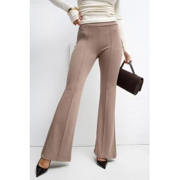 Měkké teplákové kalhoty vyrobené z materiálu typu máslo, mimořádně jemného, elastického a příjemného na dotek. Model je charakterizován vysokým pasem a širokými zvonovými nohavicemi, které stylizaci dodávají volný, lehce retro charakter. V pasu je vsazena elastická guma zajistující ideální přizpůsobení a pohodlí při nošení po celý den. Na přední straně jsou umístěny dekorativní švy běžící po celé délce nohavice, které opticky prodlužují postavu a dodávají celku elegantní dokončení. Kalhoty se skvěle hodí do každodenních, ležérních stylizací jak do práce, tak do běžného života. Hladký materiál z viskózy a elastanu zajišťuje pohodlí, prodyšnost a krásné padání na postavě. Model bez zapínání a bez kapes, navržený s ohledem na maximální pohodlí a minimalistický styl.