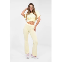 Měkké teplákové kalhoty vyrobené z materiálu typu "máslo", který je mimořádně jemný, elastický a příjemný na dotek. Model je charakteristický vysokým pasem a širokými zvonovými nohavicemi, které dodávají outfitu volný, lehce retro charakter. V pasu je vsazena elastická guma, která zajistí ideální přizpůsobení a pohodlí po celý den. Na přední straně jsou umístěné ozdobné prošívky běžící po celé délce nohavic, které opticky prodlužují postavu a dodávají celku elegantní dokončení. Kalhoty skvěle poslouží v každodenních, volných stylizacích jak do práce, tak i na běžné nošení. Hladký materiál z viskózy a elastanu zaručuje pohodlí, prodyšnost a krásné usazování se na postavě. Model bez zapínání a bez kapes, navržen s ohledem na maximální pohodlí a minimalistický styl.