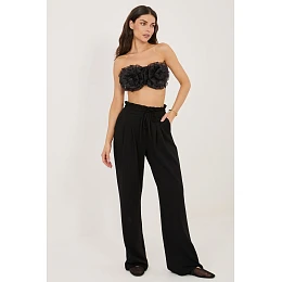 Nohavice s rovnými nohavicami sú kombináciou pohodlia a moderného štýlu, ktoré sú ideálne na každý deň. Model s vysokým pásom a záhybom v páse sa dokonale prispôsobí postave, zvýrazní pás a zabezpečí pohodlie pri nosení. Dodatočná šnúrka na stiahnutie v páse umožňuje individuálne prispôsobenie. Dlhé rovné nohavice dodávajú celému vzhľadu voľný, ale zároveň prispôsobený charakter, vďaka čomu sú nohavice ideálne na každodenné štýly aj minimalistické outfity. Sú vyrobené z príjemnej zmesi viskózy a elastanu, ktorá zaručuje mäkkosť, pružnosť a pohodlie počas celého dňa. Praktické bočné vrecká zvyšujú funkčnosť tohto modelu. Sú to univerzálne džersejové nohavice, ktoré spájajú pohodlie s módnym vzhľadom.