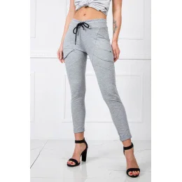 Módne tepláky sú dnes základom šatníka každej ženy, ktorá má rada najnovšie trendy v obliekaní. Nech už preferujete akýkoľvek štýl obliekania, určite si z času na čas radi oblečiete pohodlné tepláky. Tento jednoduchý model z našej najnovšej kolekcie basic je veľmi univerzálny a nadčasový, pretože ho môžete ľahko kombinovať s ďalšími kúskami oblečenia. Má veľmi módny strih so štíhlymi nohavicami a vysokým pásom, ktorý zvýrazňuje ženskú postavu a podčiarkuje jej proporcie. Tepláky majú navyše elastický pás a šnúrku, takže si ich môžete pohodlne prispôsobiť tvaru svojej postavy. Model je vyrobený z vysoko kvalitného materiálu s vysokým podielom bavlny, ktorý je príjemný na dotyk a priedušný.