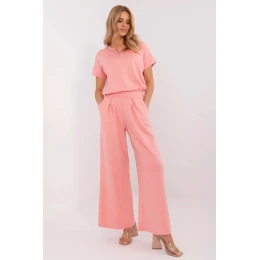Štýlové palazzo nohavice so širokými nohavicami, ktoré spájajú pohodlie a eleganciu pri každodennom nosení. Sú vyrobené z mäkkej zmesi viskózy, polyesteru a elastanu a poskytujú pohodlie a voľnosť pohybu. Hladký materiál a široké nohavice im dodávajú moderný, mierne nadrozmerný charakter. Vysoký pás s elastickým pásom zaručuje ideálne prispôsobenie sa postave a ozdobné záložky na prednej strane im dodávajú jedinečný vzhľad. Model bez zapínania, vybavený praktickými bočnými vreckami. Skvelé na každý deň, na športové aj elegantnejšie outfity.