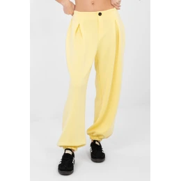 Tieto tepláky na každodenné nosenie typu jogger sú kombináciou pohodlia a štýlového vzhľadu, ideálne na každý deň a do práce v uvoľnenom štýle. Sú vyrobené z mäkkej a elastickej zmesi viskózy s prídavkom elastanu, čo zaručuje pohodlie pri nosení a voľnosť pohybu. Hladký model so vzorom s ozdobnými záložkami na prednej strane dodáva nohaviciam elegantný charakter. Zadný elastický pás zaručuje dobré prispôsobenie sa postave. Manžety nohavíc zvýrazňujú strih joggerov a zaručujú pohodlie. Nohavice nemajú zapínanie a bočné vrecká zvyšujú ich funkčnosť. Celkový dojem dotvára ozdobný gombík, ktorý je štýlovým detailom. Ideálne na každodenné nosenie s mikinou, svetrom alebo tričkom.