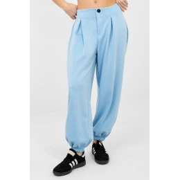 Voľné nohavice typu jogger sú kombináciou pohodlia a štýlového vzhľadu, ideálne na každý deň a do pracovného prostredia s uvoľneným štýlom. Sú vyrobené z mäkkej a elastickej viskózovej zmesi s prídavkom elastanu, čím zabezpečujú pohodlie a voľnosť pohybu. Hladký vzor a ozdobné záložky na prednej strane dodávajú nohaviciam elegantný charakter. Elastická guma v prednej časti zabezpečuje dobré prispôsobenie sa telu. Manžety nohavíc zvýrazňujú joggerový strih a zabezpečujú pohodlie pri nosení. Nohavice nemajú zapínanie, bočné vrecká zvyšujú ich funkčnosť. Celkový dojem dotvárajú ozdobné gombíky, ktoré sú štýlovým detailom. Ideálne na každodenné oblečenie so svetrom, mikinou alebo košeľou.