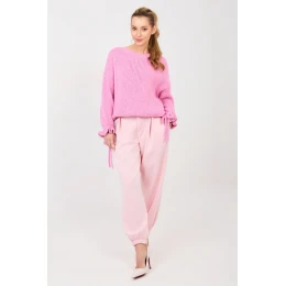 Tieto voľné nohavice typu jogger sú kombináciou pohodlia a štýlového vzhľadu, ideálne na každodenné nosenie a do uvoľneného pracovného prostredia. Sú vyrobené z mäkkej a elastickej zmesi viskózy s prídavkom elastanu a poskytujú pohodlie pri nosení a voľnosť pohybu. Model má hladký vzor a ozdobné záložky na prednej strane, ktoré dodávajú nohaviciam elegantný charakter. V zadnej časti je vložený elastický pás, ktorý zabezpečuje dobré prispôsobenie sa postave. Nohavice sú ukončené pásom, ktorý zdôrazňuje joggerový strih a zabezpečuje pohodlie pri nosení. Nohavice nemajú zapínanie a bočné vrecká zvyšujú ich funkčnosť. Celkový vzhľad dotvára ozdobný gombík, ktorý je štýlovým detailom. Ideálne na každodenné štylizovanie so svetrom, mikinou alebo košeľou.