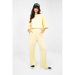 Veľmi pohodlné tepláky z "maslového" materiálu, ktorý je veľmi mäkký, jemný a mimoriadne príjemný na dotyk. Vďaka zmesi viskózy a elastanu sú nohavice elastické, ľahké a ideálne sa prispôsobia postave, čím poskytujú maximálne pohodlie každý deň. Široký strih nohavíc je očarujúci, ponúka voľnosť pohybu a moderný vzhľad. Vysoký pás s gumou v páse zaručuje ideálne prispôsobenie a pohodlie pri nosení a absencia zapínania zaručuje jednoduché a rýchle obliekanie. Hladký dizajn dodáva nohaviciam minimalistický charakter a bočné vrecká pridávajú funkčnosť bez toho, aby narúšali jednoduchú líniu strihu. Ideálne pre ženy, ktoré ocenia pohodlie, mäkkosť a moderný, voľný štýl.