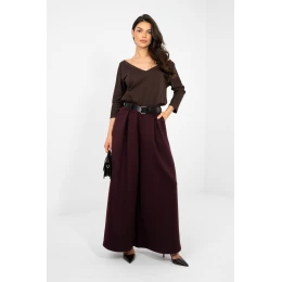 Elegantní kalhoty typu palazzo jsou kombinací pohodlí a elegance v moderním provedení. Vyrobené z vysoce kvalitní směsi viskózy, polyesteru a elastanu, lákají na velmi měkkou, jemnou a velmi příjemnou látku typu mýdlo. Materiál krásně padne na postavě, poskytuje pohodlí po celý den. Model s vysokým pasem má v pasu vsazenou gumu, která zaručuje ideální přizpůsobení bez pocitu stísnění. Navíc dodaný opasek s přezkou zdůrazňuje pas a dodává celku elegantní charakter. Chybějící klasické zapínání zvyšuje uživatelský komfort. Široké nohavice ve stylu palazzo dodávají postavě lehkost a volnost, zatímco ozdobné kontrafaldy na přední straně přidávají kalhotám rafinovaný akcent. Hladký vzor z něj činí univerzální model, který se snadno stylizuje, skvěle se hodí jak na každý den, tak i do práce. Boční, vsunuté kapsy zvyšují funkčnost, spojují praktičnost s elegantním stylem.