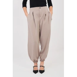 Voľné nohavice typu jogger sú kombináciou pohodlia a štýlového vzhľadu, ideálne na každý deň a na voľnejší štýl do práce. Sú vyrobené z mäkkej a elastickej zmesi viskózy s prídavkom elastanu, čo zaručuje pohodlie pri nosení a voľnosť pohybu. Model s hladkým vzorom a ozdobnými záhybmi na prednej strane dodáva nohaviciam elegantný charakter. Elastický pás na zadnej strane zaručuje dobré prispôsobenie sa postave. Nohavice sú zakončené manžetami, ktoré zvýrazňujú strih joggerov a zaručujú pohodlie pri nosení. Nohavice nemajú zapínanie a bočné vrecká zvyšujú ich funkčnosť. Celkový dojem dotvára ozdobný gombík, ktorý je štýlovým detailom. Ideálne na každodenné nosenie k mikine, svetru alebo košeli.