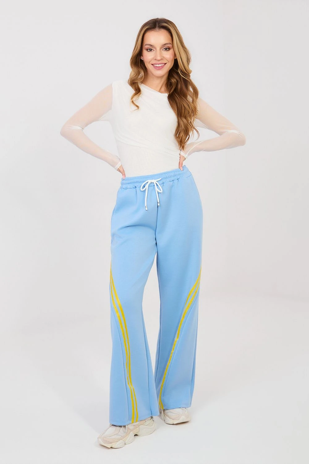 Dámské tepláky jsou pohodlnou a stylovou volbou na každý den, ideální pro ženy, které ocení pohodlí a módní, ležérní vzhled. Skvěle se hodí na každodenní aktivity, procházky, nákupy nebo relaxaci doma. Model je vyroben z příjemné směsi materiálů: polyesteru, viskózy a elastanu. Díky tomu jsou tepláky měkké, elastické a dobře se přizpůsobují postavě, zajistí plnou volnost pohybu. Tepláky mají vysoký pas, který zajišťuje pohodlí nošení a hezky zdůrazňuje pas. V pasu je praktické šňůrkování, umožňující individuální přizpůsobení postavě. Na bocích jsou umístěny praktické kapsy, ideální na drobné předměty. Hladký materiál dodává teplákům univerzální charakter, zatímco módním akcentem jsou skloněné pruhy umístěné na přední straně nohavic, které přidávají celku moderní a sportovně elegantní styl. Je to skvělá volba pro ženy, které chtějí spojit pohodlí tepláků s módním každodenním vzhledem.