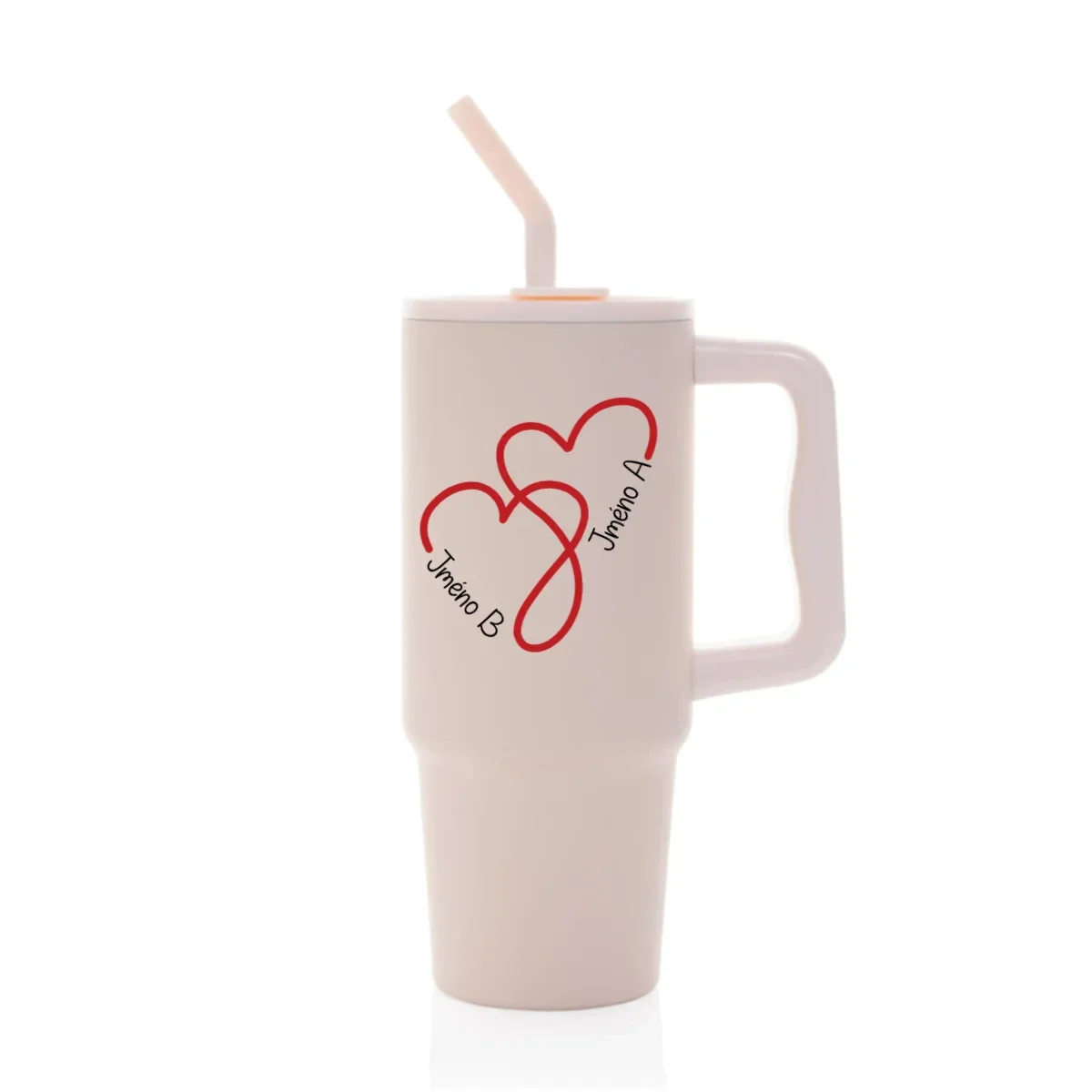 Láska v každém doušku. 💞 Originální velký cestovní termohrnek (900 ml) s motivem propletených srdcí, ke kterému si sami zvolíte dvě jména – ideální pro zamilované, novomanžele, kamarády nebo jako výjimečný dárek z lásky.