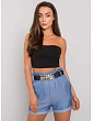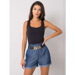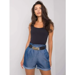 Tmavomodré šortky s vyhrnutými nohavicami.