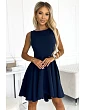 Elegantné šaty s dlhším zadným dielom z materiálu príjemného na dotyk v tmavomodrej farbe. sukňa s dlhším zadným dielom je ideálna na tanec. zapínanie vzadu na krytý zips. vyrobené v Poľsku. značka Numoco.