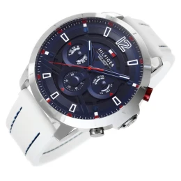 Wyrazisty model, który dumnie prezentuje kolory marki — intensywną czerń, głęboki granat oraz eleganckie akcenty w odcieniach czerwieni i bieli, nawiązując bezpośrednio do klasycznej palety kolorystycznej logo Tommy Hilfiger. Srebrna koperta otacza głęboką, metaliczną tarczę w odcieniu granatu, która przyciąga wzrok swoją intensywnością i grą światła. Białe indeksy na tle granatowej tarczy nadają całości wyrazistości i gwarantują doskonałą czytelność.Granatowo-białe wskazówki dodają subtelnego kontrastu, podkreślając dbałość o detale, a czerwony przycisk chronografu oraz sekundnik w tym samym kolorze wprowadzają odważne akcenty, który ożywiają całą kompozycję. Biały pasek z granatowymi i wytłaczanym napisem HILFIGER przeszyciami to kropka nad "i" — elegancki, a jednocześnie dynamiczny element, który dodaje zegarkowi sportowego charakteru i wyjątkowego stylu.