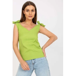 Rovný strih topu s výstrihom do V. Horné ramienka s ozdobnými viazankami. Skvelé na mnohé príležitosti.