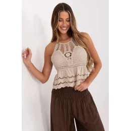 Štýlový top v boho štýle, vyrobený z priedušného, priesvitného úpletu, ktorý krásne zvýrazňuje letný charakter oblečenia. Model s krátkou dĺžkou a okrúhlym výstrihom má jemné ramienka, ktoré sa zaväzujú za krkom aj na chrbte, vďaka čomu sa top dokonale prispôsobí postave. Priliehavé, vystužené košíčky zaisťujú pohodlné nosenie a jemne podopierajú poprsie, vďaka čomu nie je potrebné nosiť podprsenku. Dominantným materiálom je prírodná bavlna s prídavkom elastanu, vďaka čomu je top nielen príjemný na dotyk, ale aj elastický. Ideálny k džínsovým šortkám, dlhým sukniam alebo voľným nohaviciam s vysokým pásom, ktorý nesmie chýbať vo vašom letnom šatníku.