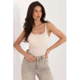 Toto ležérne tričko so zabudovanou podprsenkou je pohodlnou a štýlovou voľbou na každý deň. Je vyrobené z mäkkej pruhovanej viskózovej tkaniny s prídavkom elastanu, perfektne sedí a poskytuje pohodlie a správnu oporu bez potreby nosenia dodatočnej spodnej bielizne. Krátka dĺžka, model na ramienka s moderným štvorcovým výstrihom jemne zvýrazňuje dekolt a ramená. Hladký vzor dodáva tričku univerzálny charakter, zatiaľ čo jemné čipkované lemovanie na výstrihu a ramienkach dodáva celku ženskú eleganciu a ľahkosť. Ideálne na každodenný styling, buď samostatne, alebo pod sako či sveter.