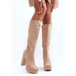 Módne dámske čižmy z ekologického semišu. Stoja na hrubej platforme a pevnom ihličkovom podpätku. Model sa zapína na zips. Predkolenný zvršok, hranatá špička. Skvelý strih, vďaka ktorému vyniknete z davu. Bez zateplenia. Musíte mať!