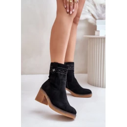 Klasické dámske čižmy z eko semišu. Stoja na podpätku. Zaoblená špička. Tento model má prešívanie na zvršku a drobný detail. Zateplená vnútorná časť s mäkkým návlekom na obuv, ideálna na chladnejšie dni.