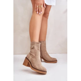 Klasické dámske čižmy z eko semišu. Stoja na podpätku. Zaoblená špička. Tento model má prešívanie na zvršku a drobný detail. Zateplená vnútorná časť s mäkkým návlekom na obuv, ideálna na chladnejšie dni.