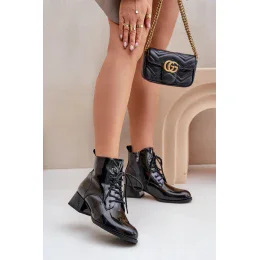 Dámske čižmy z prírodnej kože. Osadené sú na podpätku v tvare kocky. Majú zips na boku a šnurovacie zapínanie, ktoré umožňuje správne prispôsobenie topánky šírke chodidla. Päta je spevnená, špička je zaoblená. Vo vnútri sú vystužené podšívkou príjemnou na dotyk.