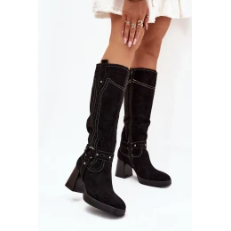 Dámske čižmy vyrobené z ekokože. Osadené na stĺpikovom podpätku. Zapínanie na zips zaručuje jednoduché obúvanie a vnútorné kožené zateplenie zaručuje teplo počas chladnejších dní. Zvršok s výškou nad kolená zdobia jemné remienky a prešívacie prvky, ktoré čižmám dodávajú charakter. Tieto čižmy budú skvelou voľbou na elegantné aj ležérne štylizácie, pričom zaručujú pohodlie a módny vzhľad.