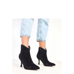 Elegantné dámske členkové čižmy z mäkkej ekokože, ktoré sa vyznačujú jemným, ale účinným detailom, ozdobou sirkona na hornom okraji päty. Táto drobná ozdoba dodáva čižmám eleganciu a dokonale sa hodí k večerným štylizáciám. 12 cm vysoký model jemne obopína členok, špicatý nos a 8,5 cm stĺpikový podpätok krásne zjemňujú postavu a zabezpečujú stabilnú a pohodlnú chôdzu. Praktické zapínanie na zips uľahčuje obúvanie čižiem a vnútorná časť je vybavená mäkkou látkou bez podšívky, vďaka čomu sú čižmy ideálne na prechodné obdobie. Ideálna voľba pre ženy, ktoré ocenia eleganciu s nádychom pôvabu.