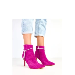 Elegantné dámske členkové čižmy vyrobené z mäkkej ekokože. Štíhla špička a 9 cm podpätok im dodávajú ženský charakter a opticky predlžujú nohy. Model je vybavený jemnou, lesklou retiazkou so zirkónmi, ktorá mu dodáva výnimočný šarm a eleganciu. 13 cm vysoký rozparok krásne obopína členok a zips uľahčuje obúvanie. Vnútro je vybavené látkou, ktorá zaručuje pohodlné nosenie. Sú to štýlové a elegantné členkové čižmy, ideálne na večerné vychádzky, formálne podujatia alebo stretnutia, ktoré si vyžadujú decentný, efektný akcent.