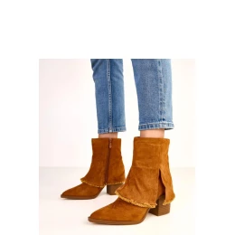 Elegantné členkové čižmy s otočeným golierom, ktoré spájajú eleganciu s moderným detailom. Sú vyrobené z kvalitnej semišovej ekokože, vyzerajú efektne a sú ideálnou voľbou na chladnejšie dni. Model má špicatý nos, ktorý opticky zjemňuje chodidlo, a 9 cm výška podpätku zaručuje stabilitu a pohodlie pri chôdzi. Otočený golier dodáva čižmám charakter a módny akcent a zips umožňuje rýchle obúvanie. Vďaka podšívke a textilnej stielke čižmy zaručujú teplo a pohodlie počas celého dňa. 13 cm výška goliera krásne obopína členok a vytvára moderný a elegantný vzhľad.