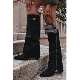 Elegantné dámske čižmy z eko semišu. Osadené na ihličkovom podpätku. Špicatá špička. Zvláštnosťou tohto modelu je otočený golier s odnímateľným remienkom v hornej časti goliera, ktorý siaha až po pätu. Zapínanie na zips. Skvelé na nosenie k šatám alebo sukniam!
